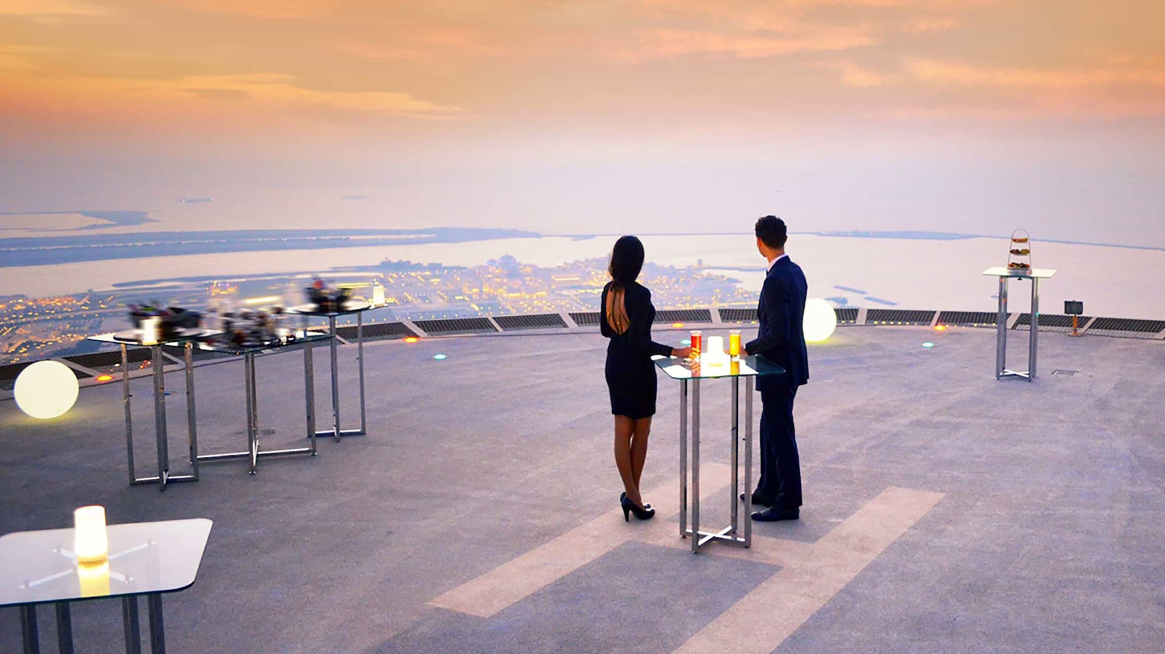 يقدّم فندق سانت ريجيس أبوظبي مرّة واحدة في الشهر تجربة تناول طعام من العمر على ارتفاع 255 متراً في الهواء. يستمتع 20 ضيفاً من أصحاب القلوب القويّة بمشاهدة غروب الشمس وهم يتناولون وجبة عشاء حصريّة على أعلى مهبط لطائرات الهليكوبتر في دولة الإمارات العربية المتحدة، مع إطلالة ساحرة على أفق مدينة أبوظبي المهيب.