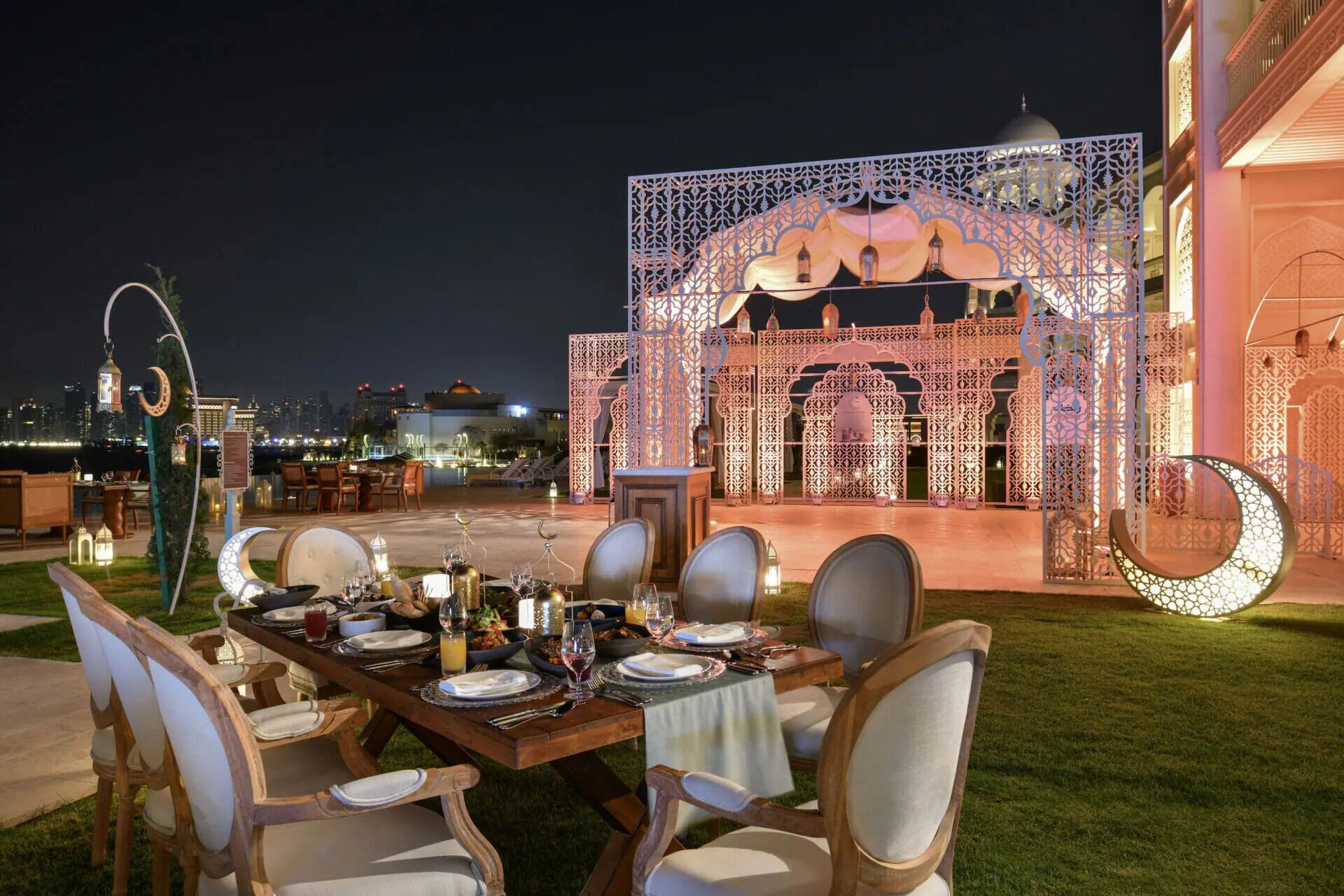 Children under 6 years dine free, while those aged 6 to 12 enjoy a 50% discount. The buffet features a variety of Arabic hot dishes, Emirati specialties, salad stations, and Arabic desserts, complemented by Ramadan juices and soft beverages.