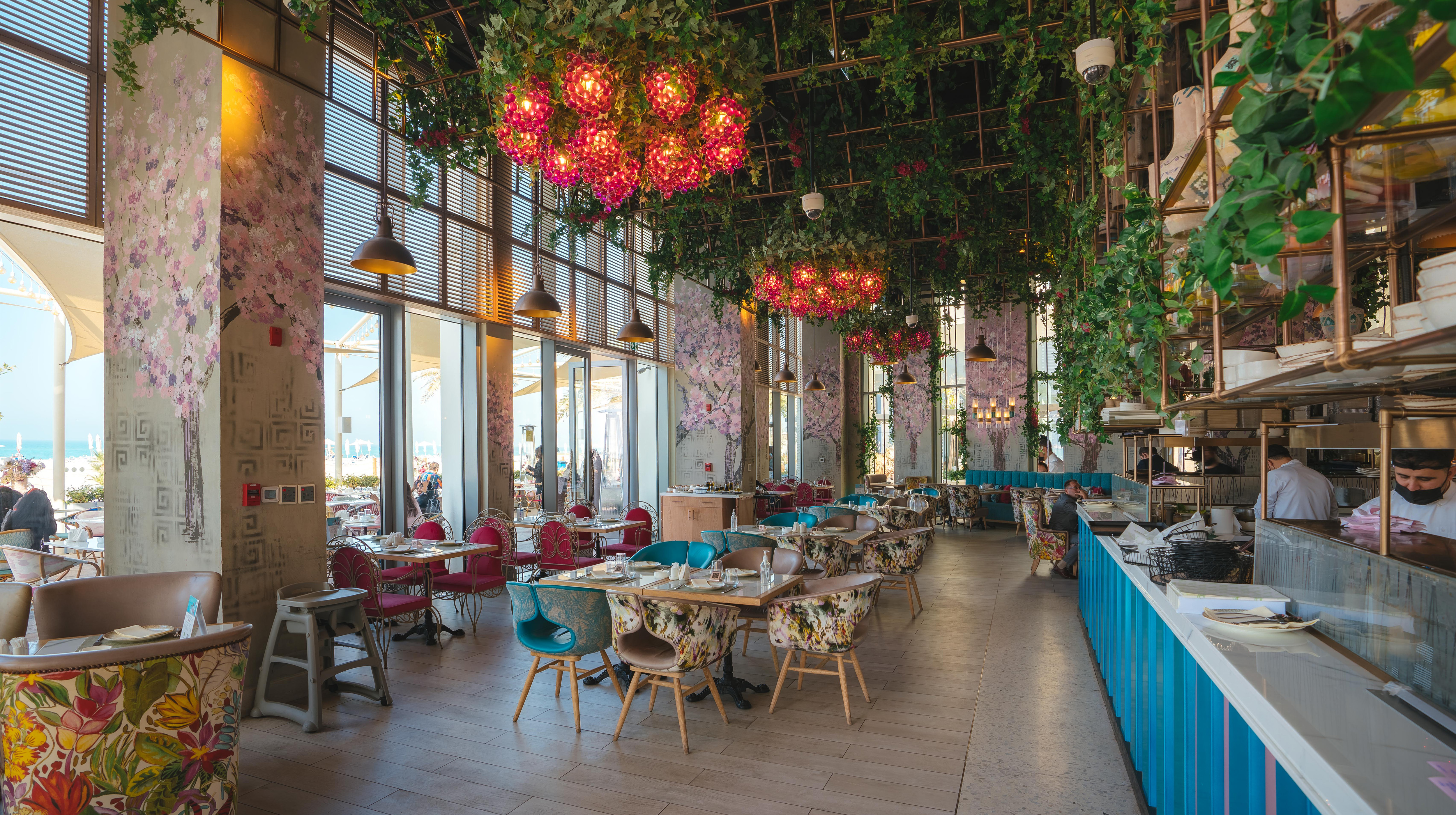 エキゾチックな観葉植物が映えるインテリアのベイルート・スール・メールの雰囲気にはきっと惚れ惚れするはず。またレストランの外では、ビーチフロントのテラスに座ってアラビア湾の壮大な景色を眺めることができます。