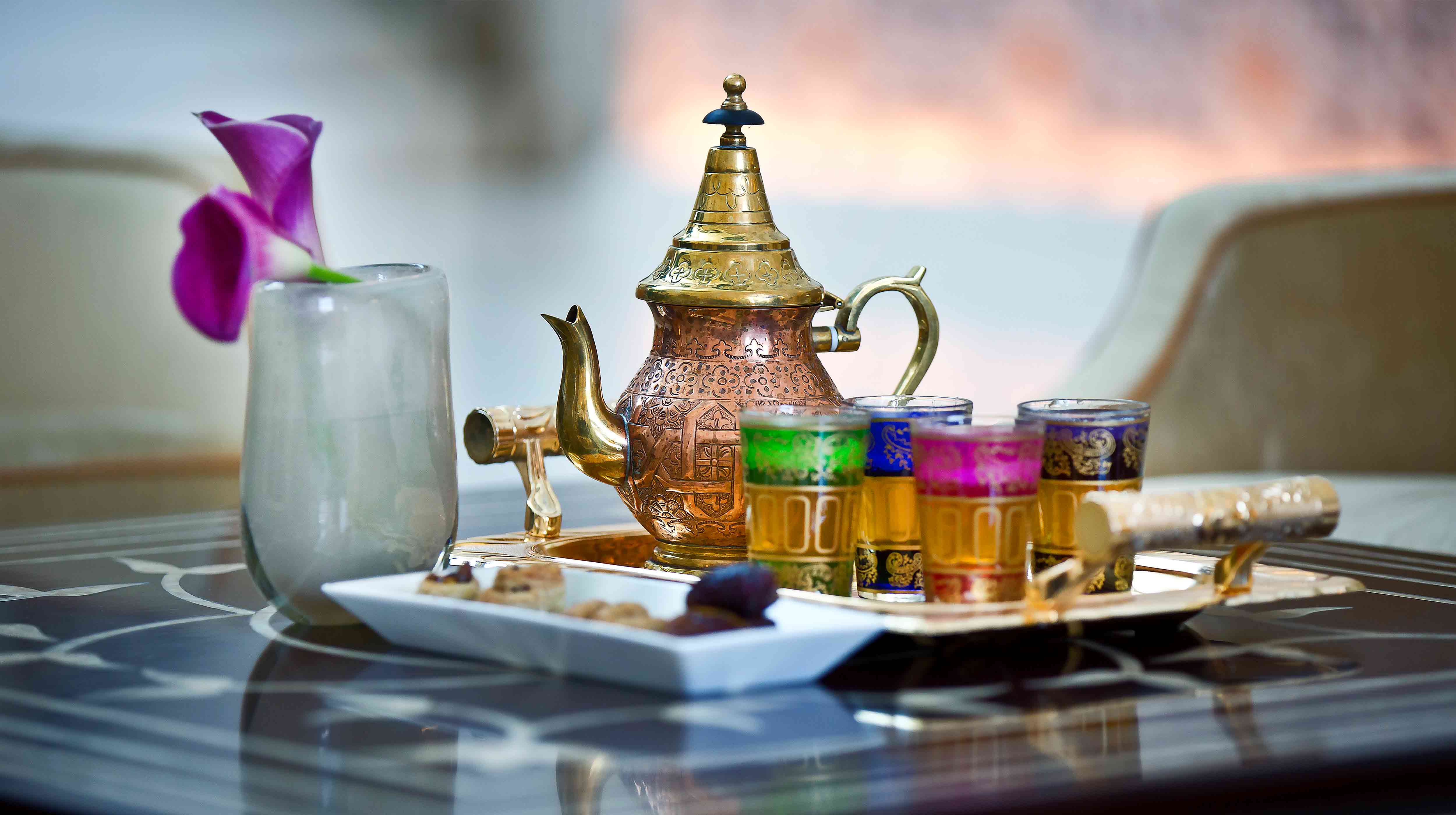 バブアルカスルホテル(Bab Al Qasr Hotel)のグランドロビーにあり、満足度の高いスポットとして知られるモルジャーナ・ティーラウンジ(Morjana Tea Lounge)は、アラビアのエレガンスを体現する場所。心なごむ噴水、そそり立つヤシの木々、癒やしのピアノの音、アラビアの伝統楽器、伝統的なウード(撥弦楽器)の調べが、お客様に和やかな瞑想の時をもたらします。